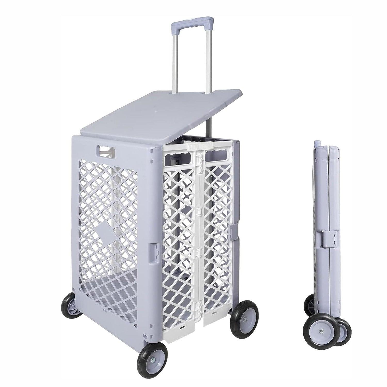 LUCKYERMORE 55L Folding Utility Shopping Cart With Lid Wheels Telescopic Handle Collapsible Rolling Crate, Gray
