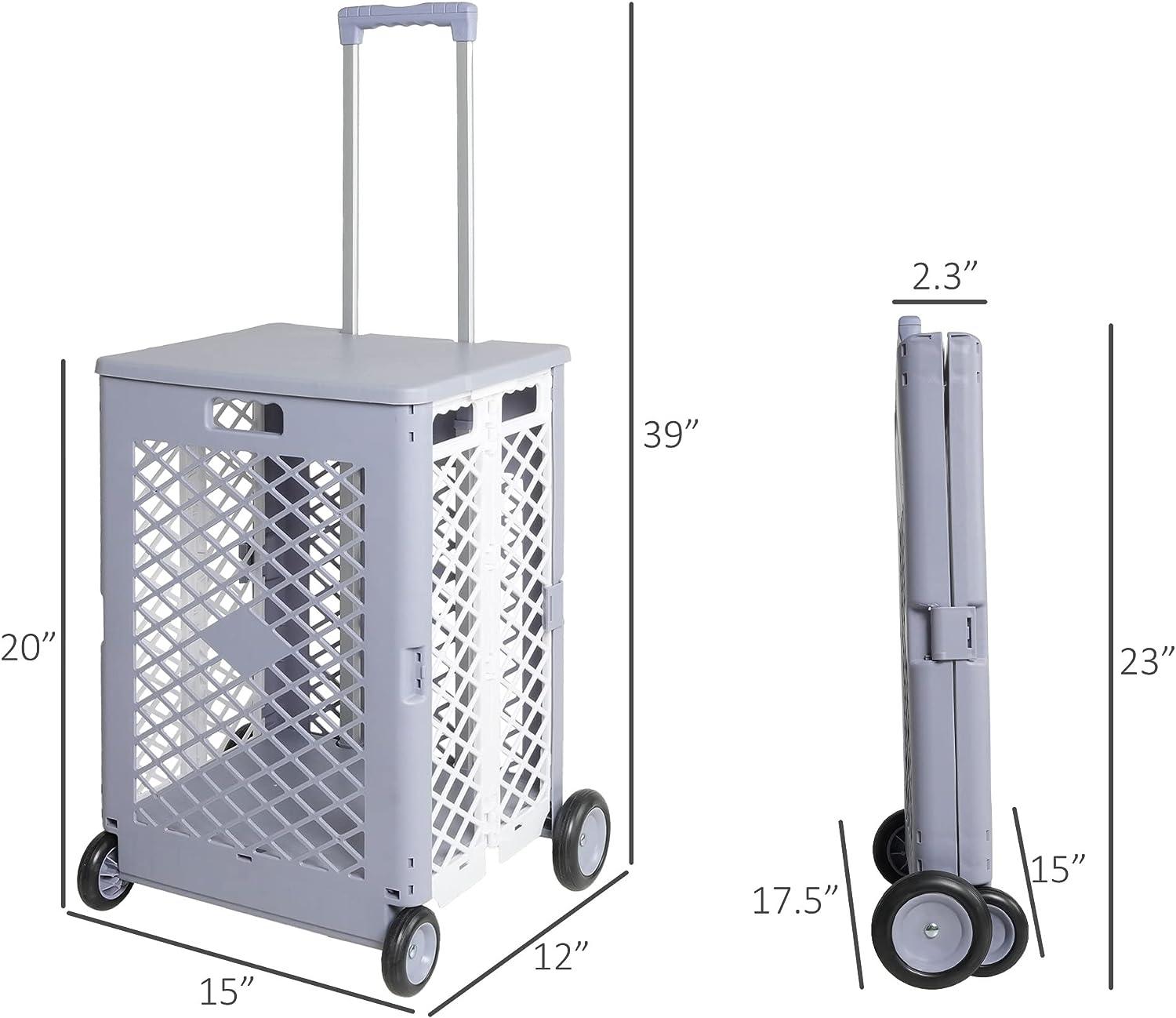 55L Folding Utility Shopping Cart With Lid Wheels Telescopic Handle Collapsible Rolling Crate, Gray