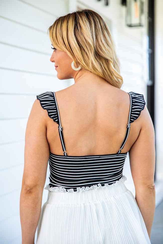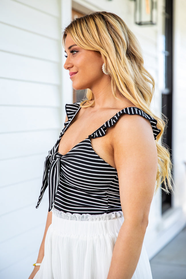 - Black Striped Tie Front Ribbed Tank Bodysuit