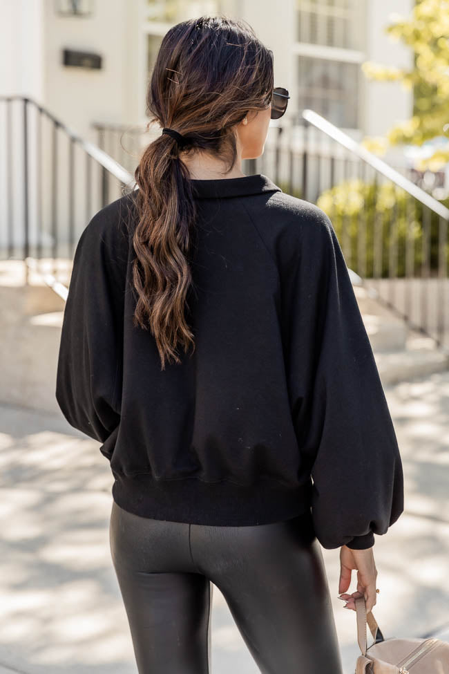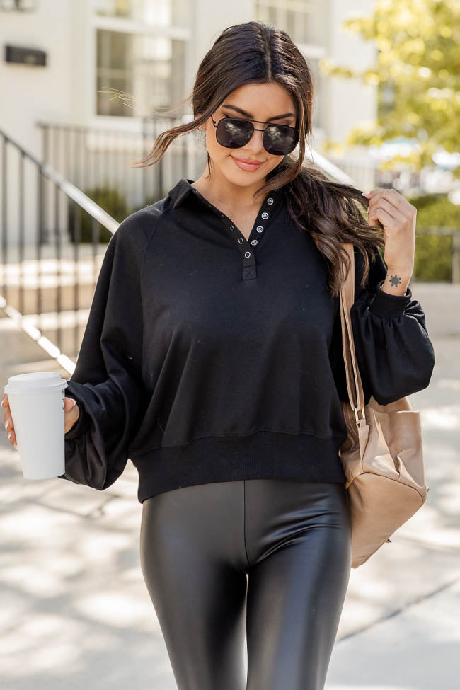 - Henley Style Snap Button Neckline With Long Balloon Style Sleeves And Slight Cropped Length