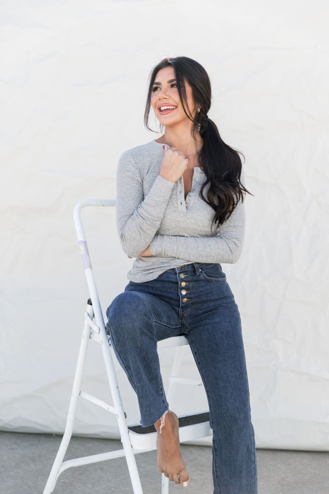 - Grey Ribbed Knit Henley Long Sleeve Tee