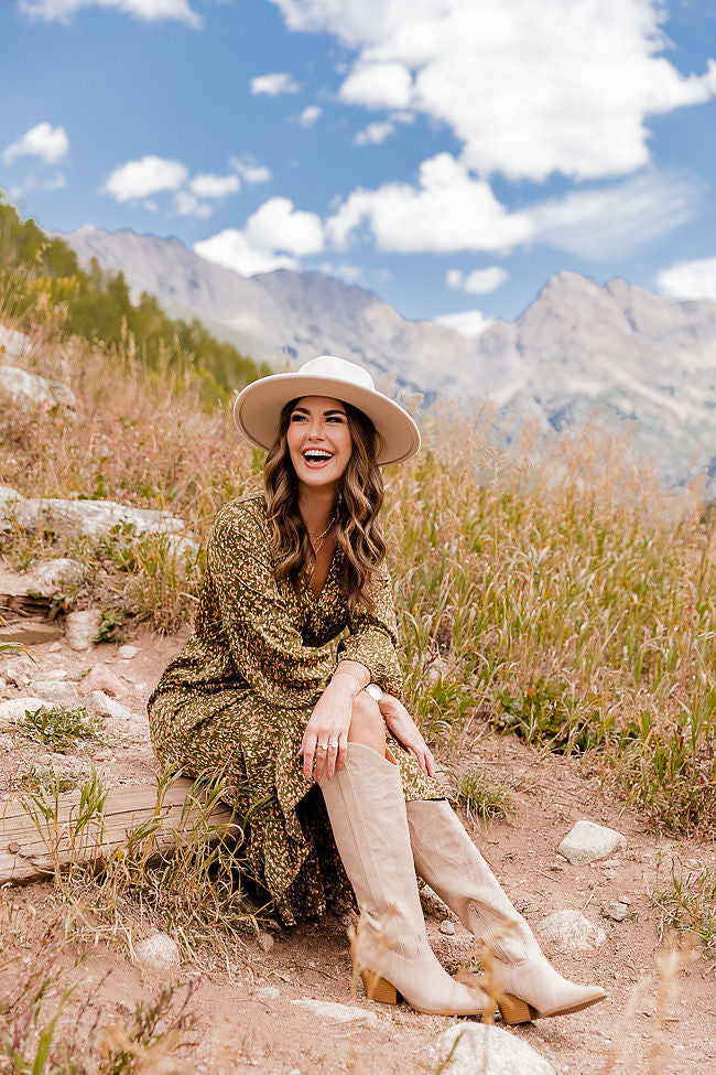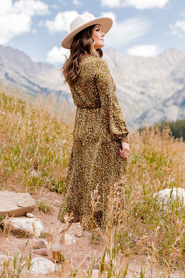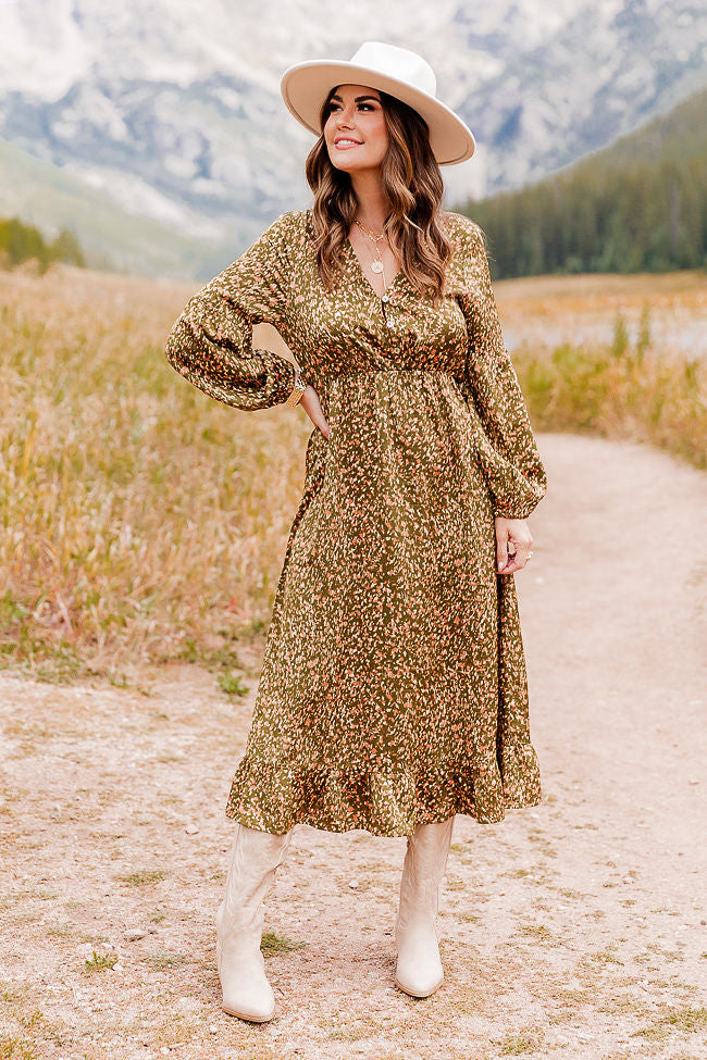 • Wrap Style V-neckline With Long Sleeves, Ruffled Hem, And Midi Length