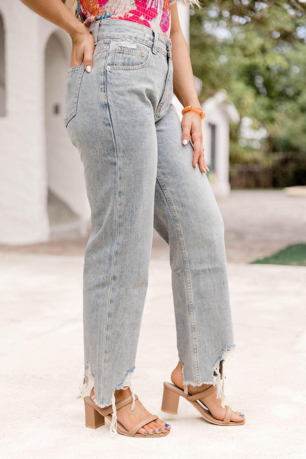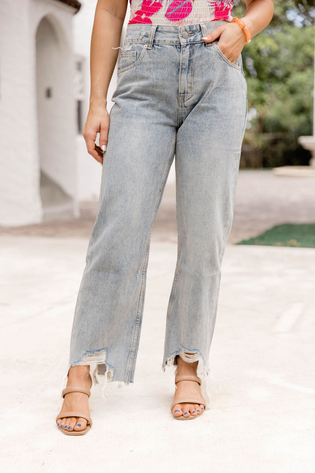 - Mid Rise “with Slightly Wider Legs And Distressed HemÂ