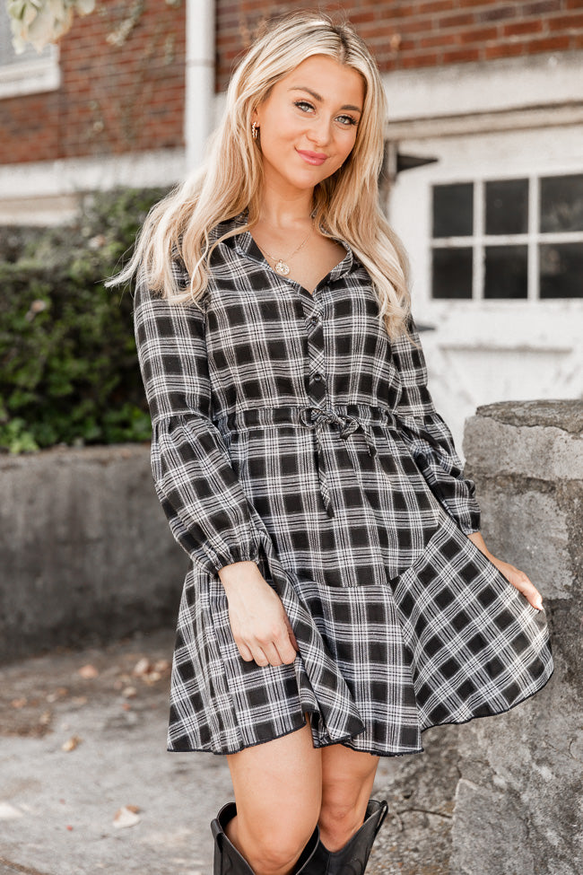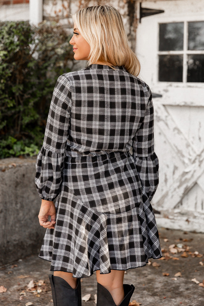 - Black Quarter Sleeve Plaid Ruffle Trim Mini Dress