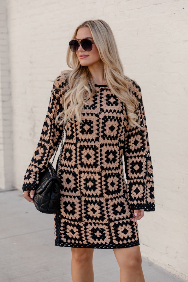 - Black And Tan Crochet Long Sleeve Lined Mini Dress