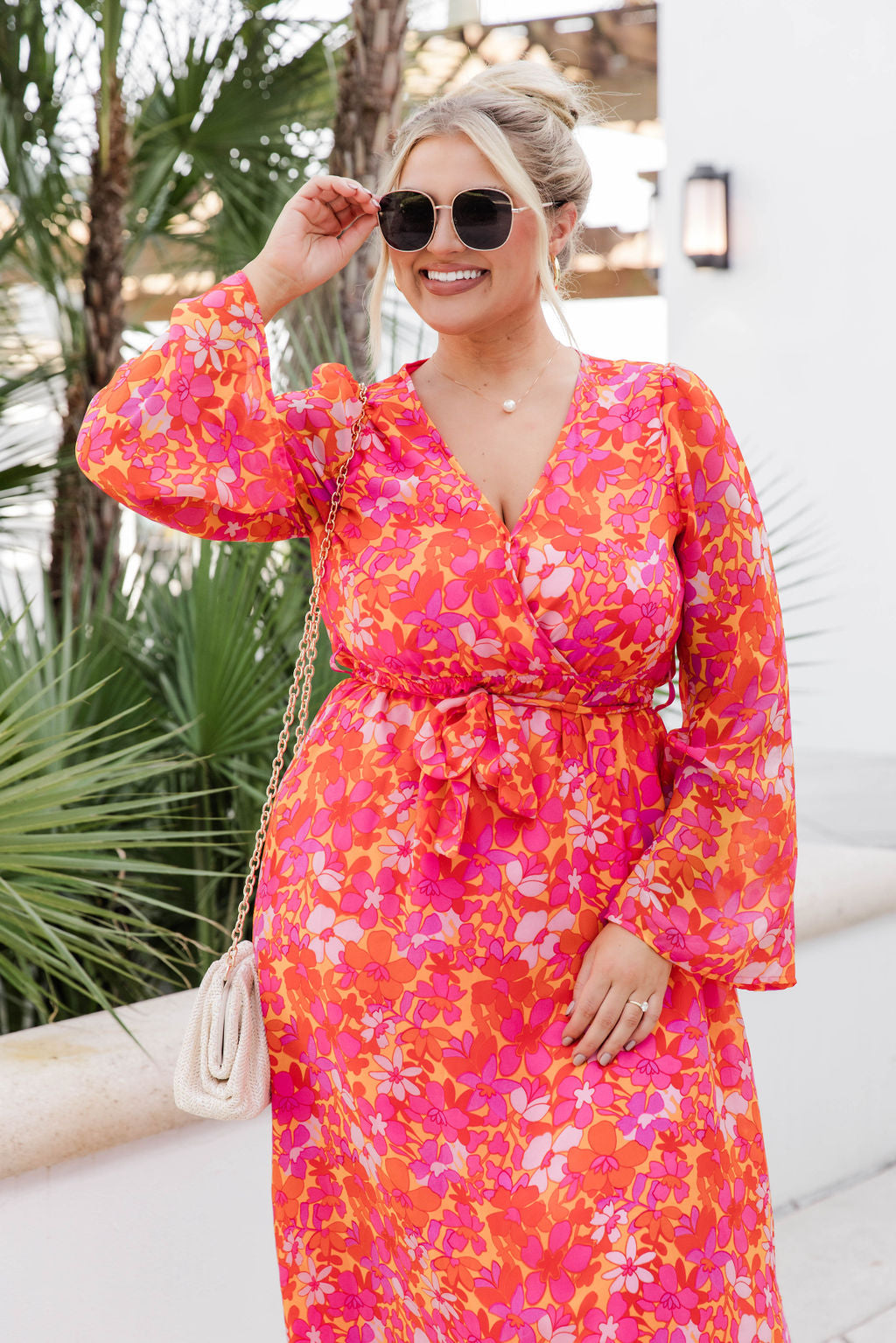 - Long Sleeve Red Tropical Printed Maxi Dress