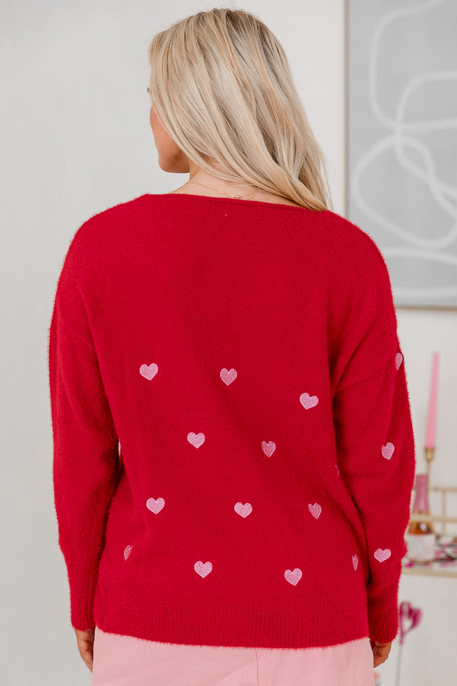 - V-neckline With Long Sleeves, Red Embroidered Heart Design, And Ribbed Hem Detailing