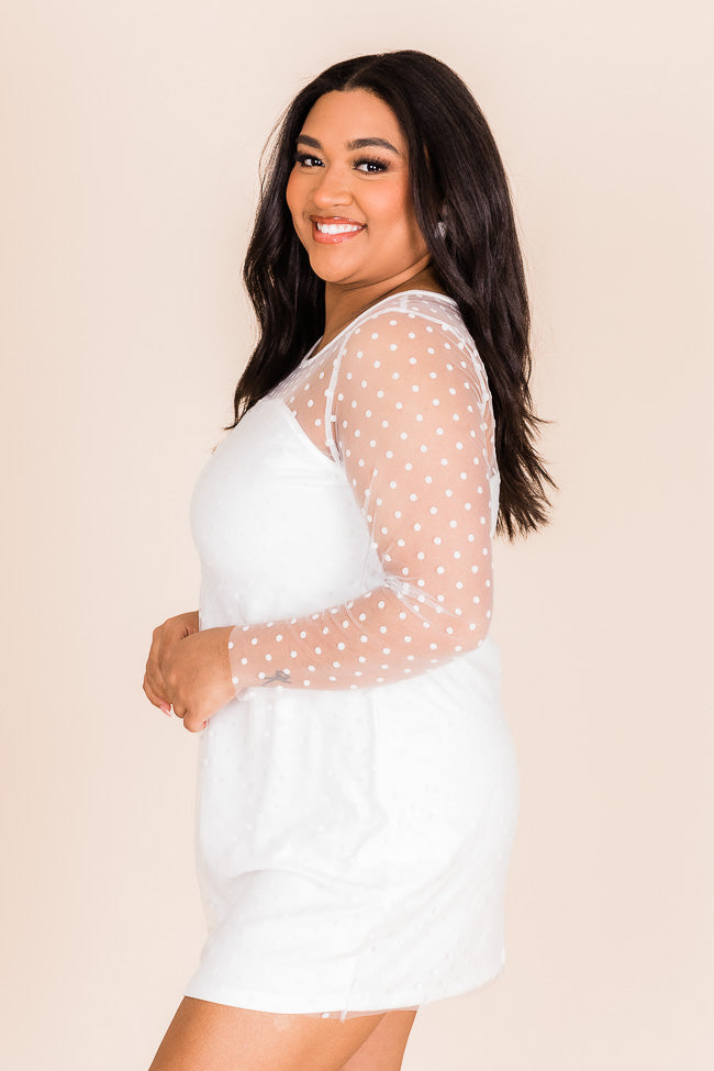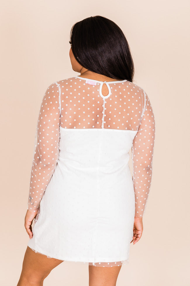 - White Polka Dot Mesh Long Sleeve Mini Dress