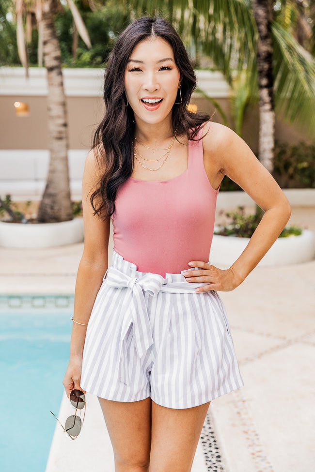 Paperbag Waist Shorts Are So Trendy This Season. We Love The Classic Stripe Print In Grey And White It’s So Chic. Plus These Shorts Feature A Tie Waist And Pockets For A Fabulous Combo. Pair These Cute Shorts With A Bodysuit And Sandals For A Fun Afternoon!