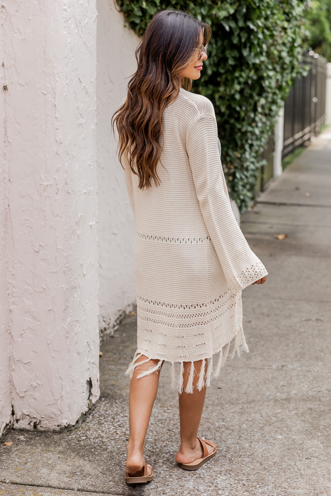 This Timeless beige Open Knit Cardigan is Such A Chic Choice For Any Upcoming Events. We Are Loving The midweight Material For Chilly Summer Nights. We Also Love The Trendy Fringe Hem And Boho Chic Look. Plus The Fun Open Knit Style On The Sleeves And Lower Half Is So Cute. There Are So Many Ways To Style This Cardigan Pair It With A Bodysuit And Shorts Or Wear Over A Tee. Any Way You Style It Will Sure Look Cute!Â