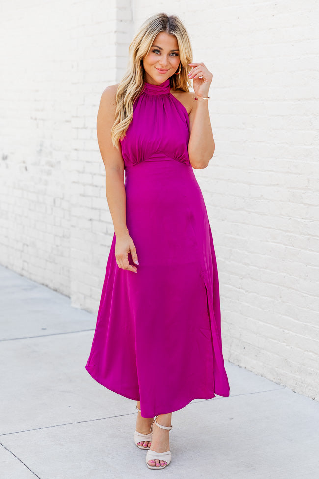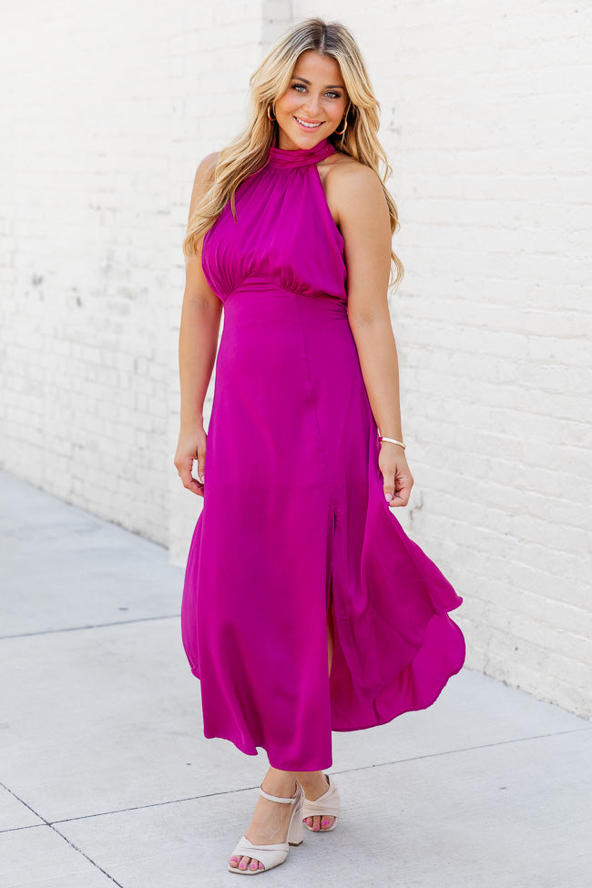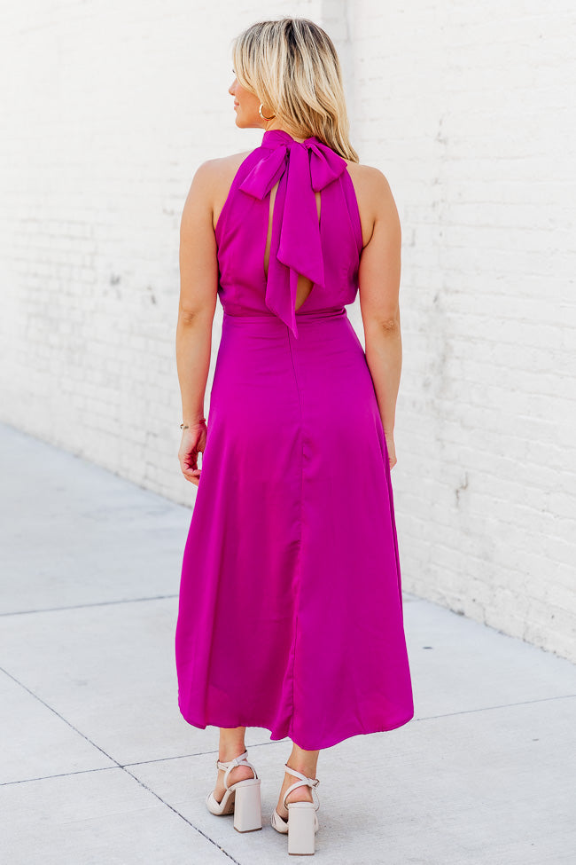 - Mock Neckline With Self Tying Back, Ruched Bust Detail, Triangle Empire Waist, Front Slit, Midi Length, And Zipper Closure