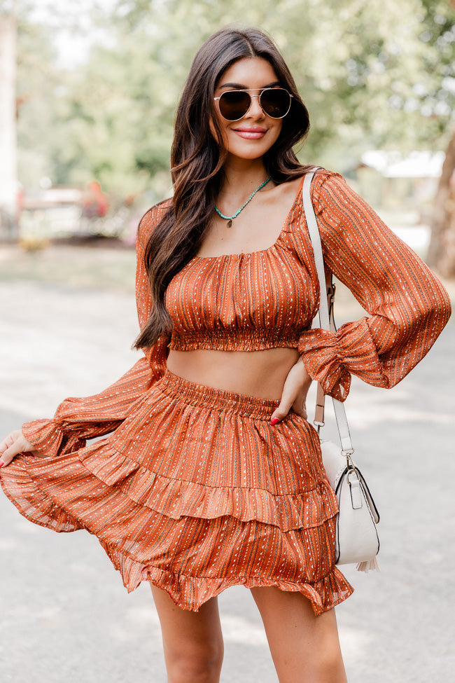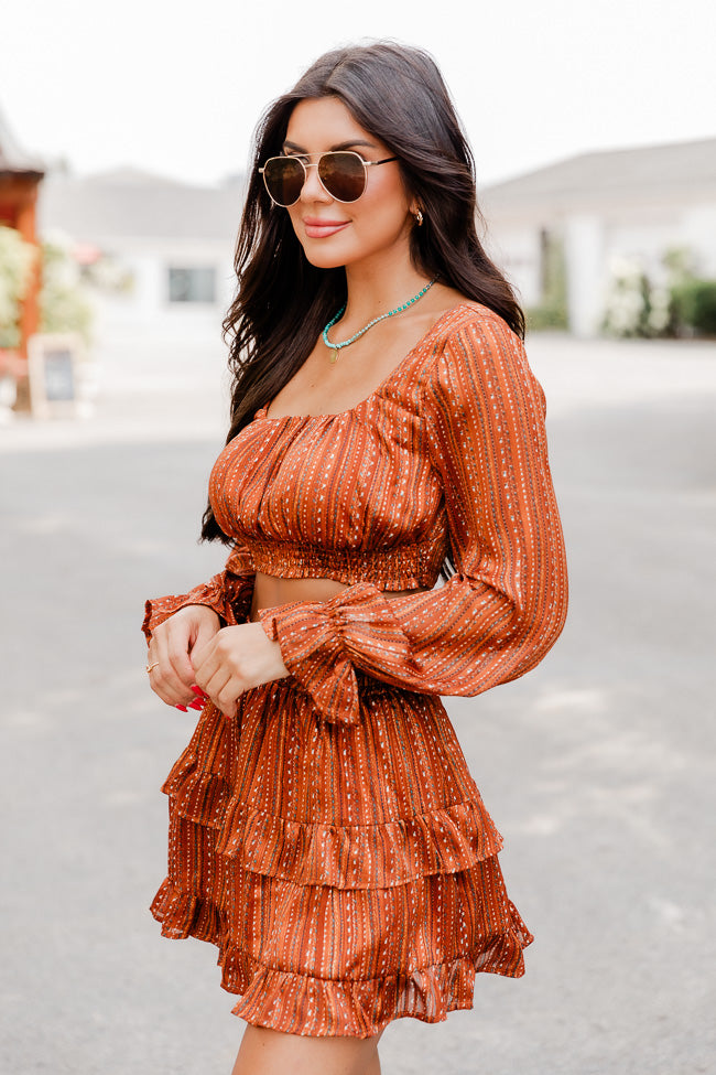 - Brown Multi Printed Long Sleeve Cropped Blouse
