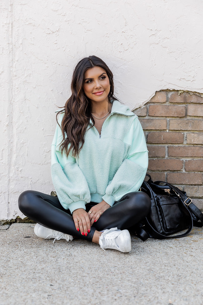 - Quarter Zip Closure With Contrasting Fuzzy Fabric, Long Bishop Style Sleeves, And Ribbed Hem