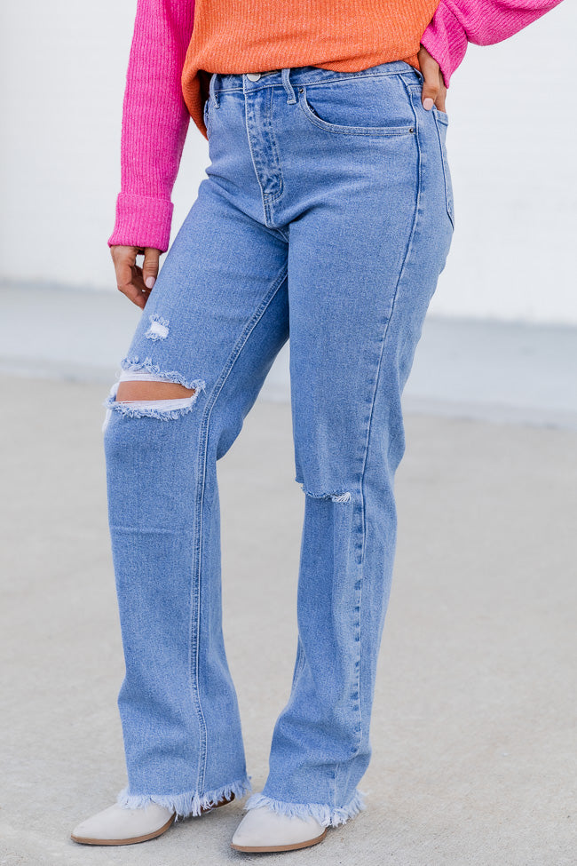 - Higher Waisted With Some Distressing And Straight Leg Style