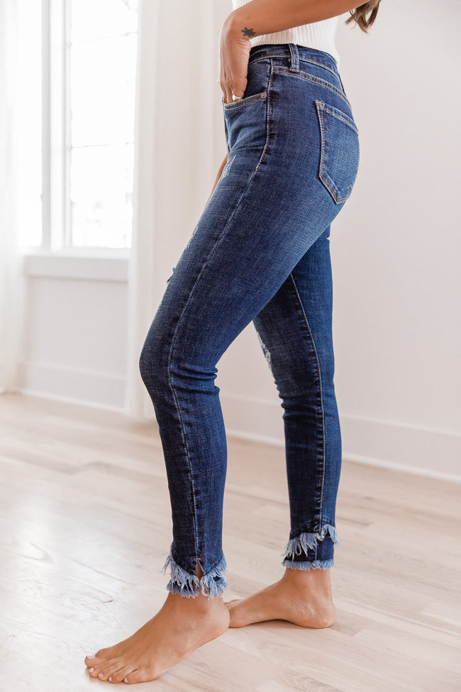 These Jeans Are Simply A Must-have For The Fall- And We Love The Material And The Distressed Look! They Also Feature A Fringe Hem That Add A Touch Of Flare! These Dark Wash Jeans Are So Easy To Pair With A Variety Of Blouses And Tanks For A Gorgeous Look! We Love This Trendy Style For Fall!