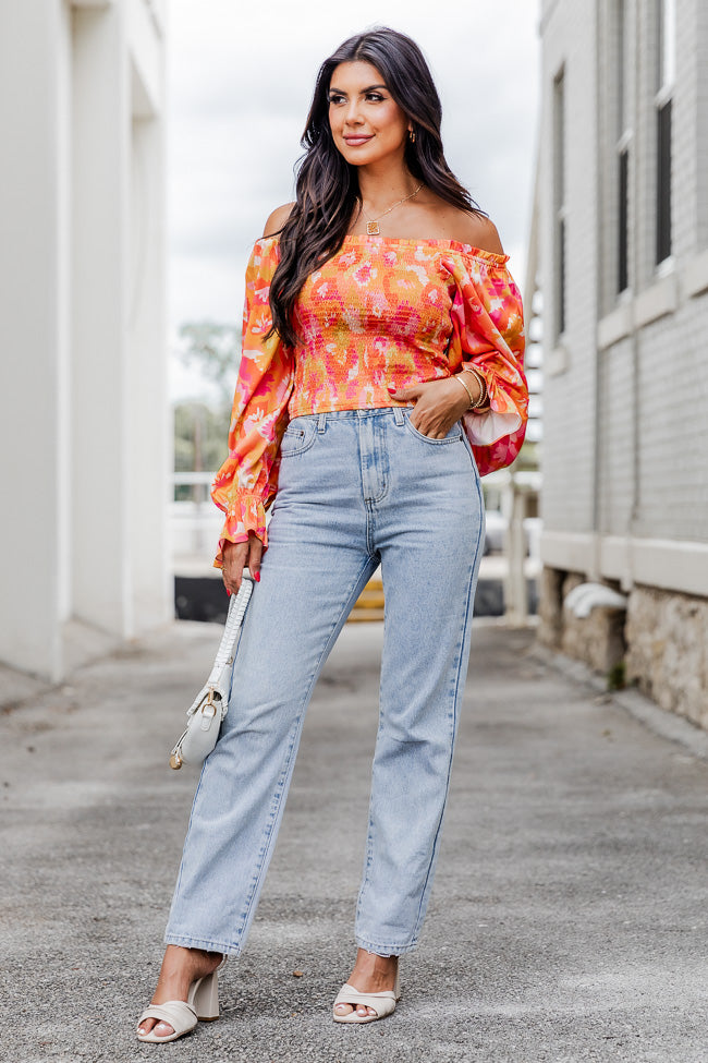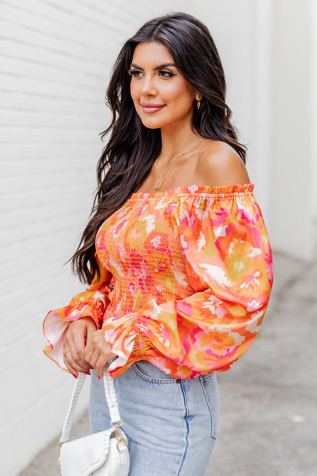 - Orange Floral Print Off The Shoulder Blouse