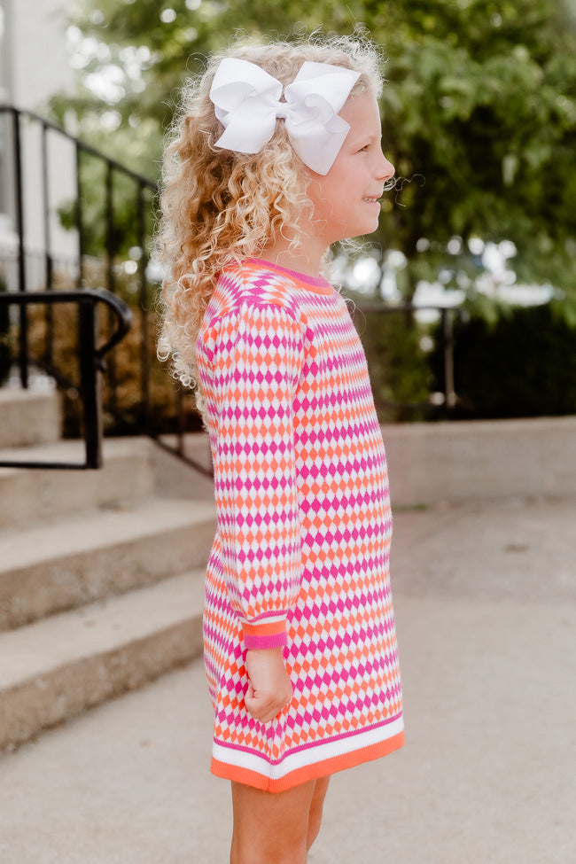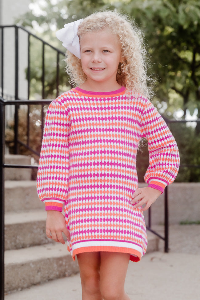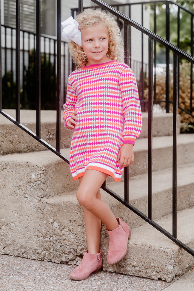 Just Watch Me Girls Pink And Orange Argyle Printed Sweater Mini Dress FINAL SALE