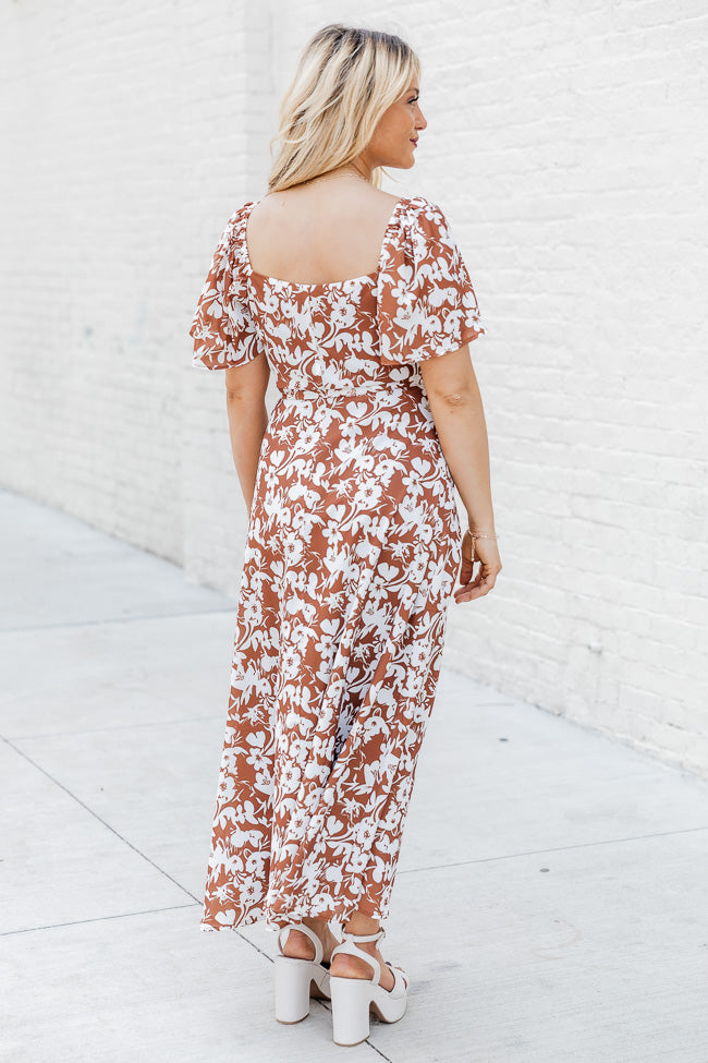 - Brown Floral Contrast Flutter Sleeve Maxi Dress
