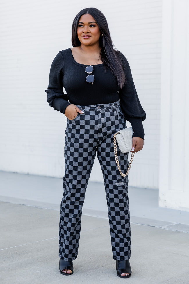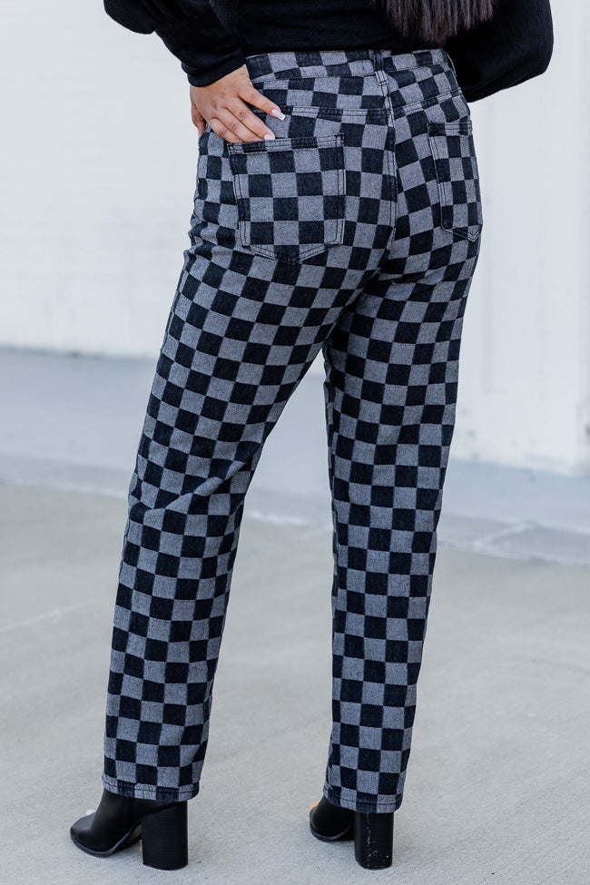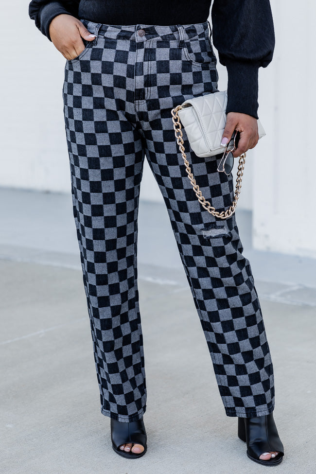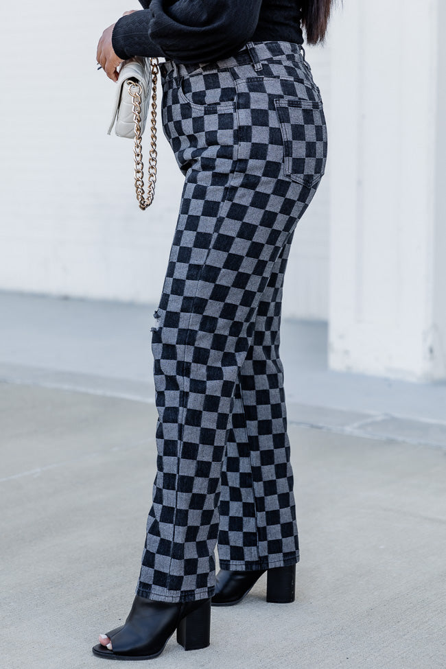 - High Waisted With Checkered Print, Light Distressing, And Straight Leg StyleåÊ