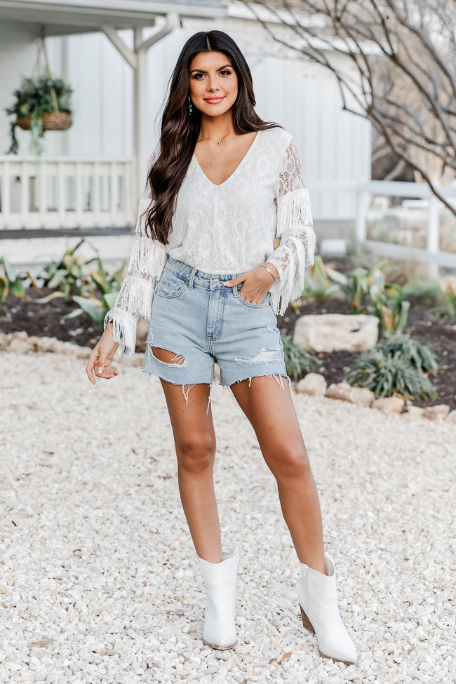 - Ivory Fringe Sleeve Lace Long Sleeve Bodysuit