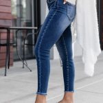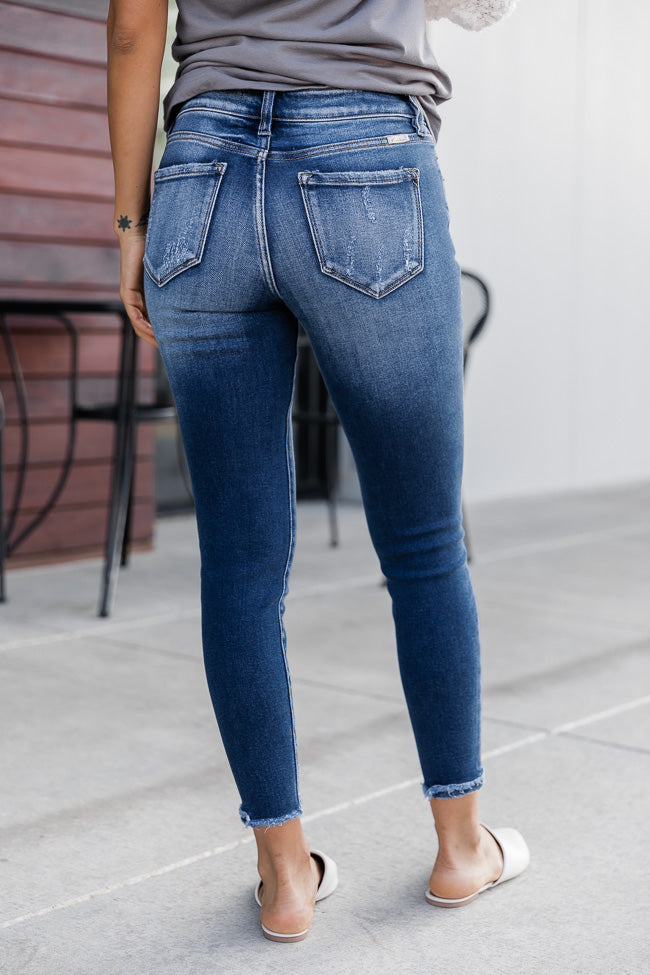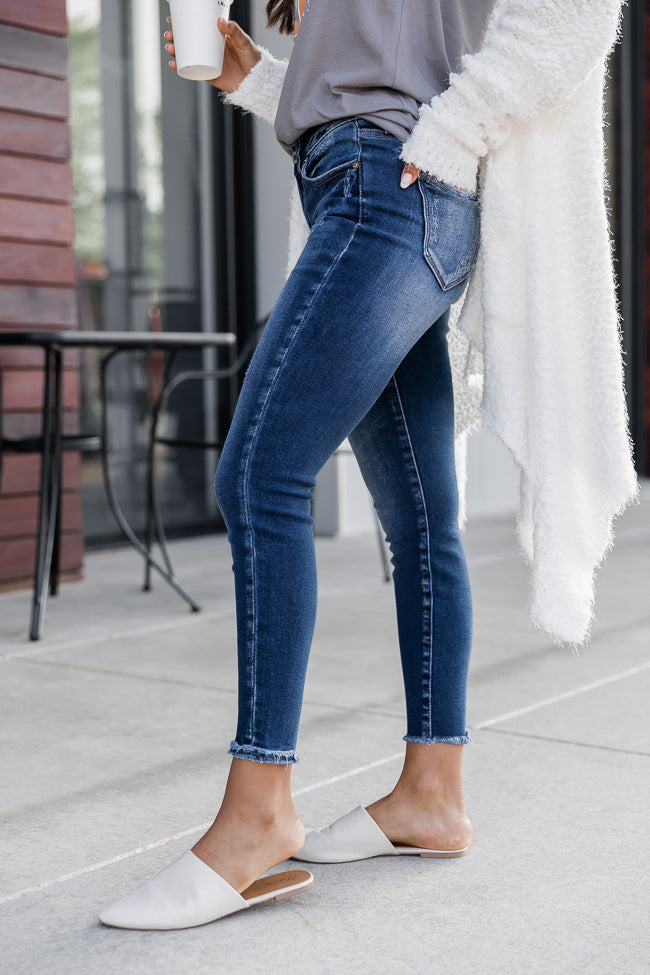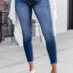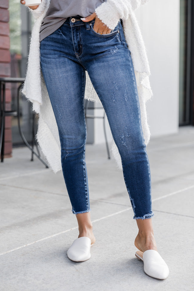 These Stylish Dark Wash Ankle SkinnyåÊjeans Are Such A Must-have Style For Any Season! We Love The Trendy Distressing On The Leg Paired With A Fun Raw Hem. Plus We LoveåÊthe Mid Rise Style, It’s So Adorable.åÊPair These Stylish Jeans With A Bodysuit And A Fedora Hat For A Day Out!