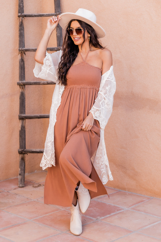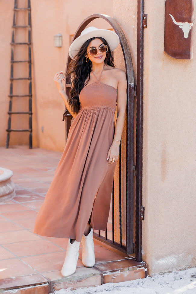 - Smocked Bust, Slits On Sides, Pockets, Self Tie Halter, Cutout In Back