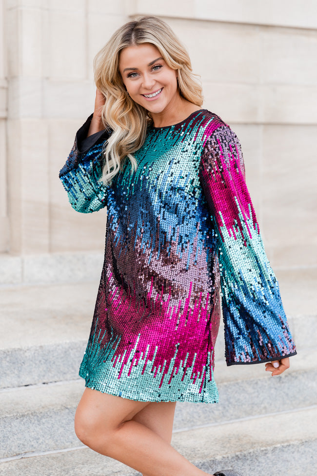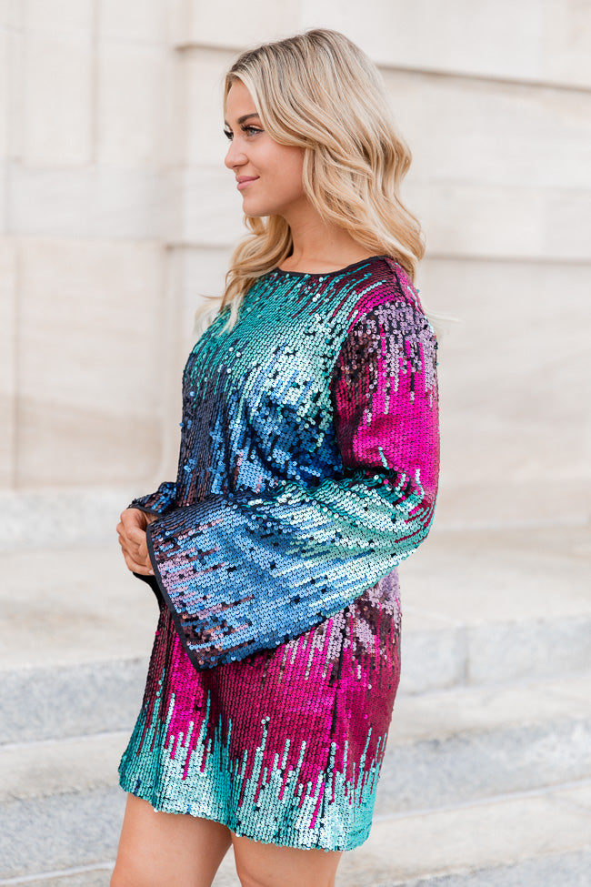- Multi Color Sequin Bell Sleeve Mini Dress