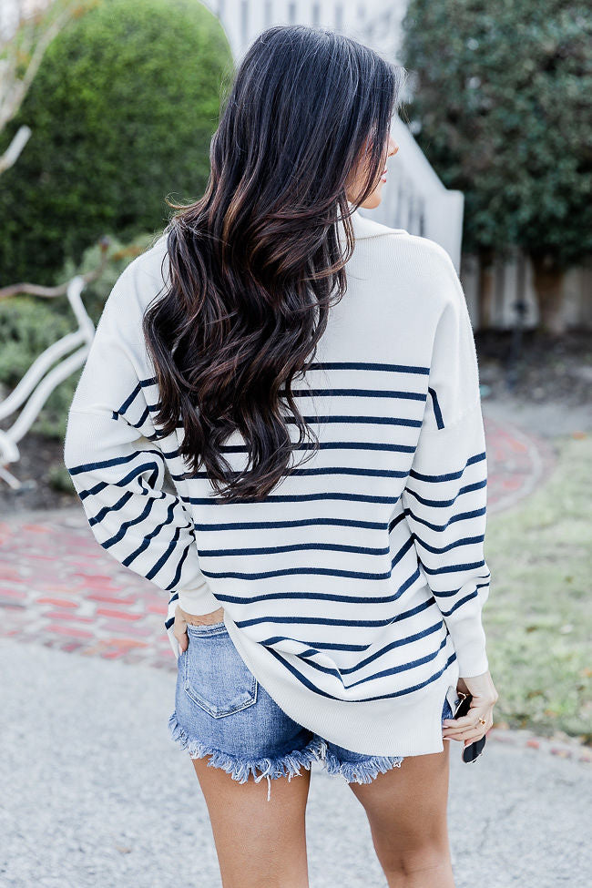 Pulling Heartstrings Ivory And Navy Stripe Quarter Zip Pullover