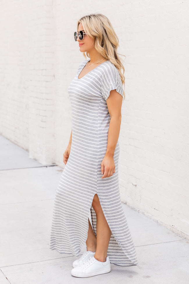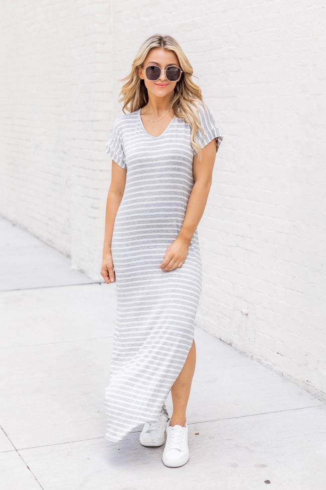 This Beautiful Striped Dress Is Made For Relaxing Summer Nights! Featuring A Timeless Grey And White Striped Material, You Can’t Go Wrong With This Classic Style! The Bodice Features A Gentle V-neckline Paired With Short Sleeves And Slits On Each Side! You Can Even Tie Up The Bottom Hemline For A Sweet Knotted Detail! Just Add Sandals And A Floppy Hat For A Must-have Look This Summer!