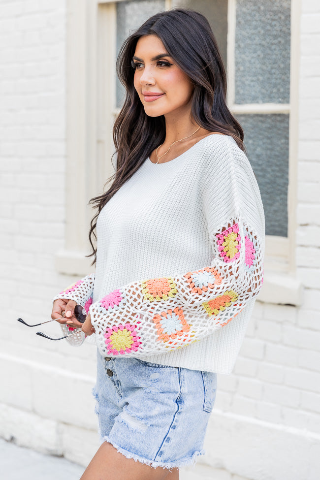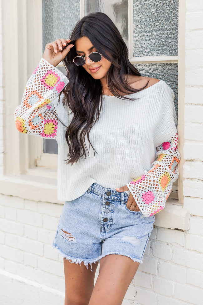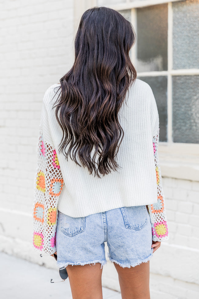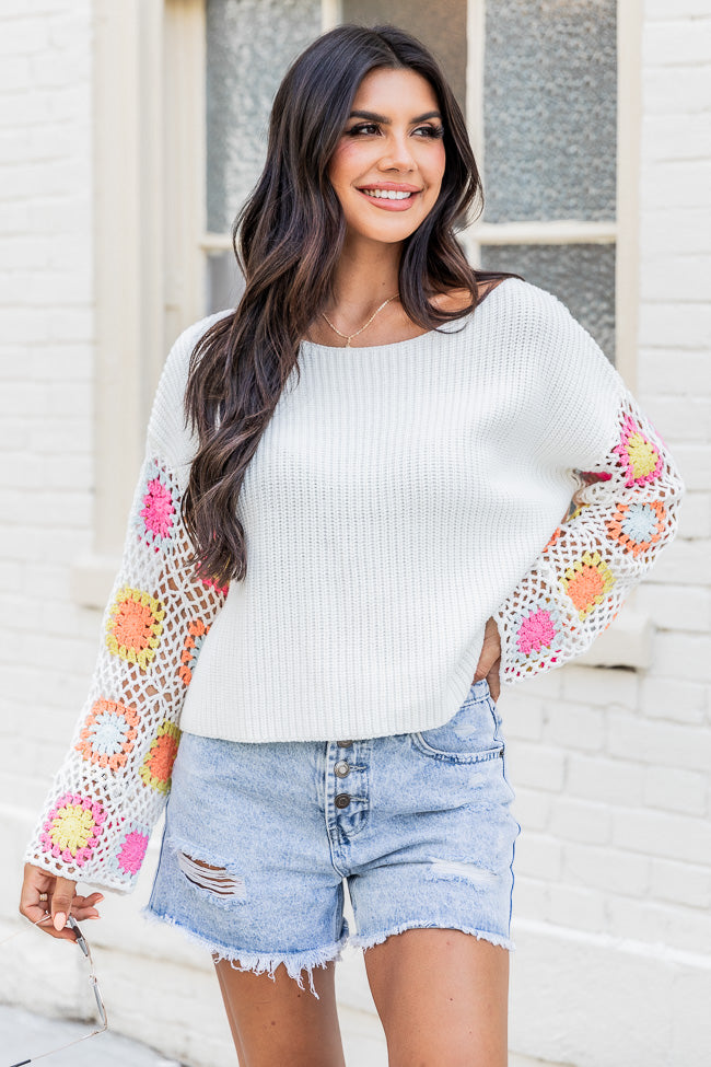 - Ivory Bright Multi Crochet Sleeve Sweater