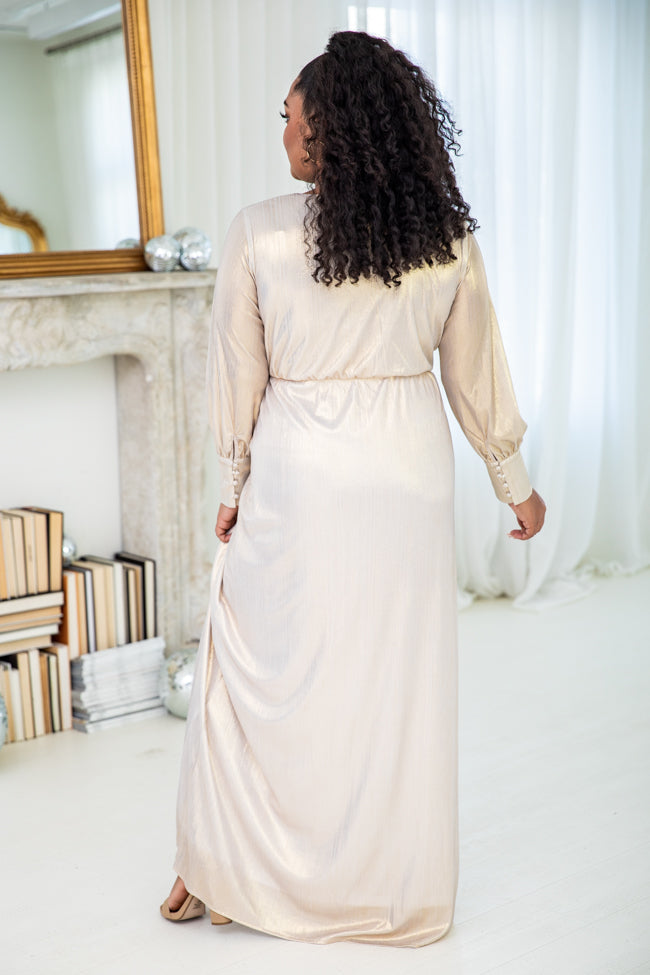 - Wrap Style V-neckline With Long Bishop Style Sleeves, Side Slit, And Maxi Length
