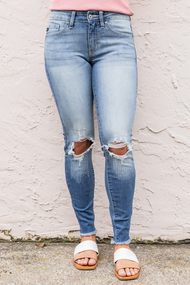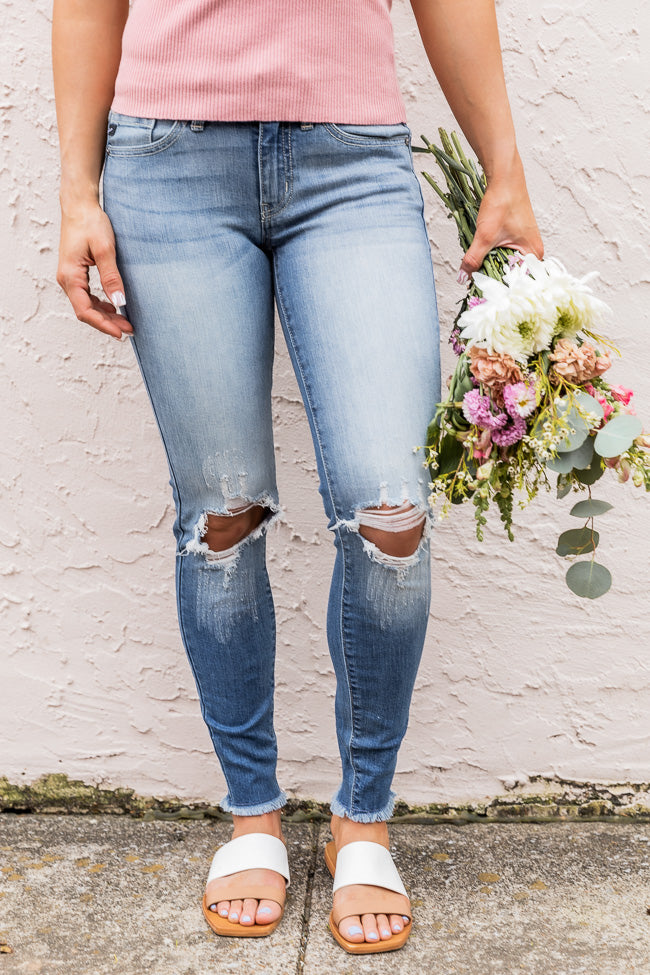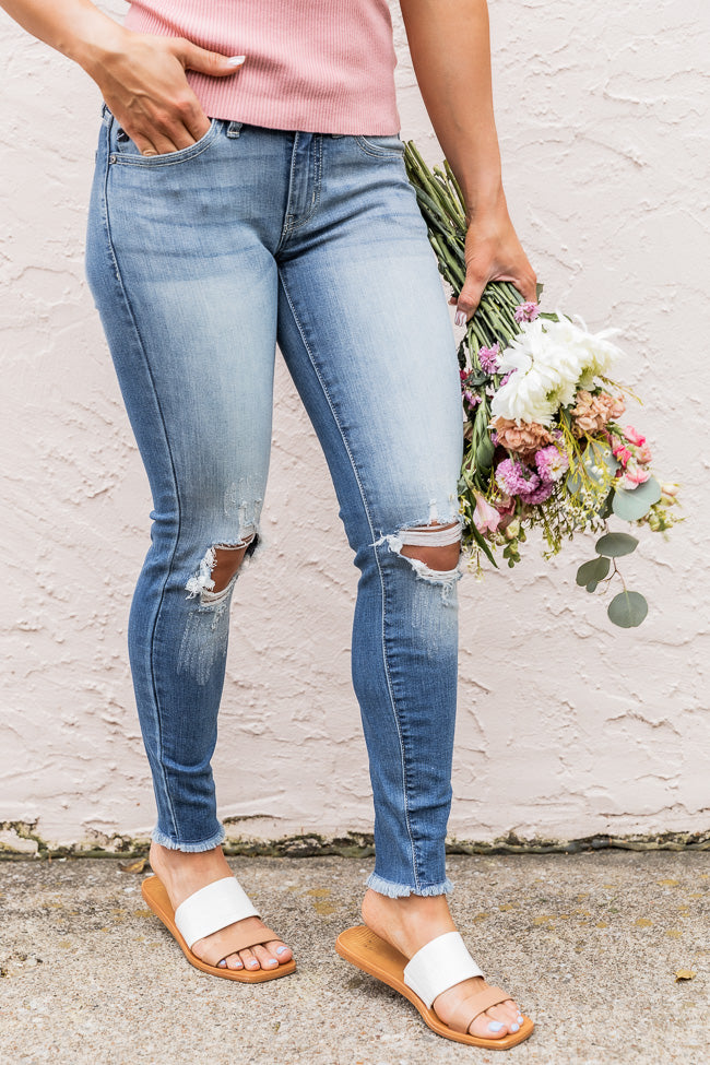 Cropped Jeans Are Simply A Must-have For Spring – And We Love The Combination Of A Jagged Fringe And Distressed Look For A Stylish And Edgy Combination! These Medium Wash Jeans Are So Easy To Pair With A Variety Of Blouses And Tanks For A Gorgeous Look! The Bottom Hemline Features A Ragged Edge And Cropped Cut, Plus The Thighs And Knees Have Ultra-distressed Patches For A Trendy Look!