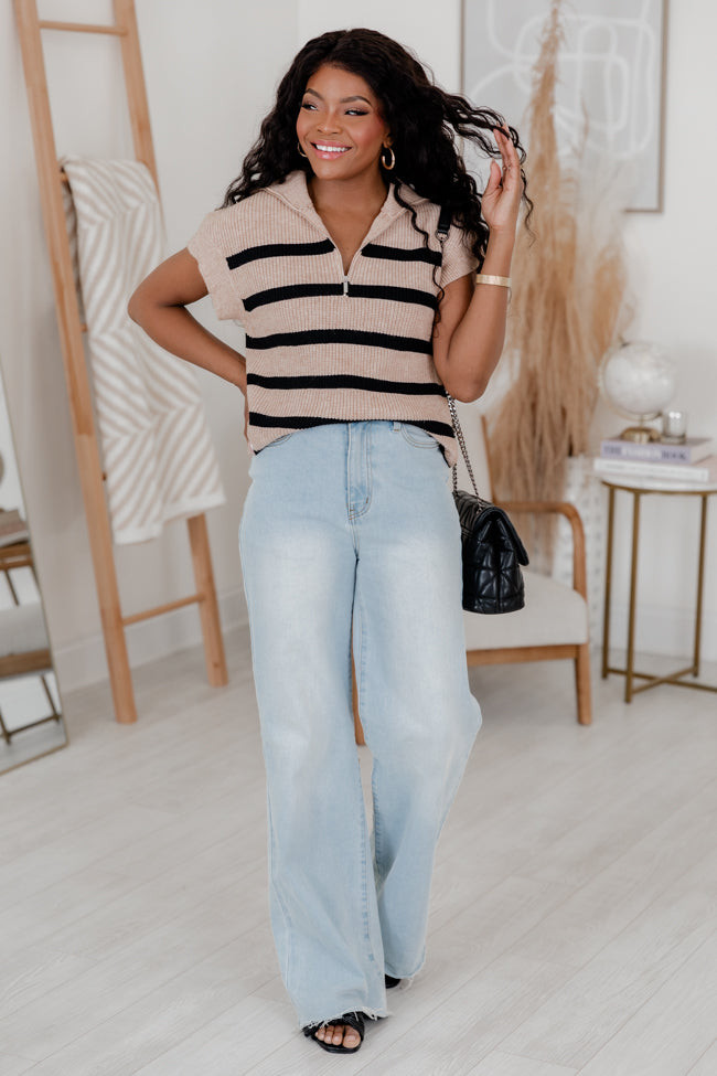 - Beige And Black Quarter Zip Striped Short Sleeve Pullover