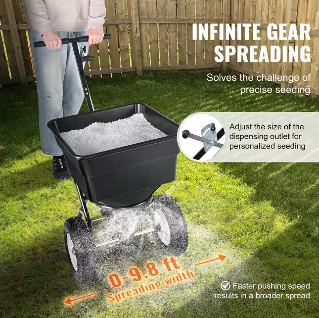 - Generous capacity: with a load-bearing capability of up to 100 lbs. and a 56l hopper, this broadcast spreader satisfies large-scale broadcasting in one go, eliminating constant refilling, the walk-behind spreader also supports the distribution of multiple types of seeds, whether you have a small lawn or a spacious yard, this spreader cart is your all-year-round companion-seed in spring, fertilize in summer, weed in autumn, and spread salt in winter