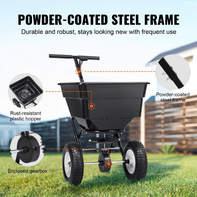 - Robust and long-lasting: crafted with a carbon steel frame and coated with a powder finish, our salt spreader is built for durability and longevity, the rust-resistant hopper is both lightweight and sturdy, additionally, with its enclosed gearbox, gears are protected from corrosion, ensuring hassle-free seeding and fertilizing