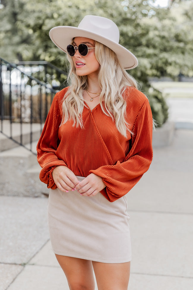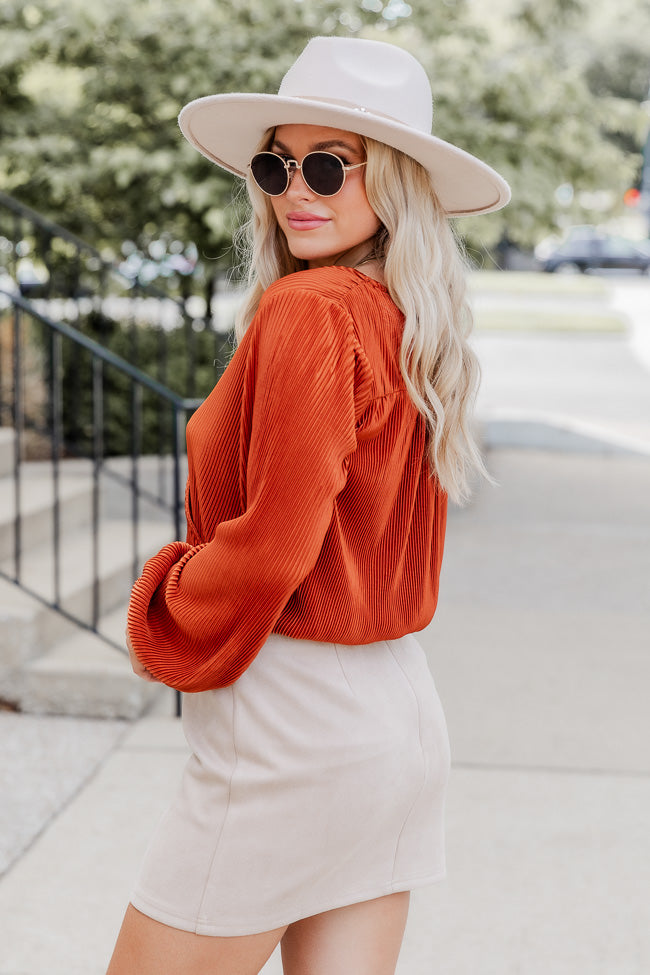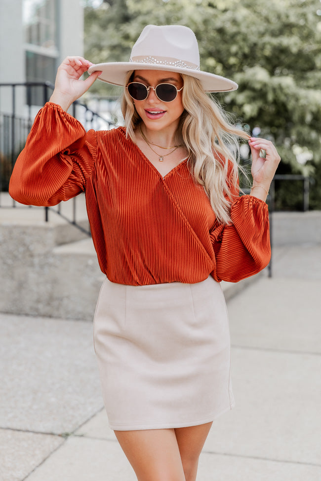 - Wrap Style V-neckline With Long Balloon Style Sleeves And Fuller Coverage Bottom